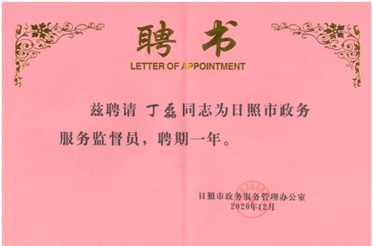 2020年12月3日,日照市政府服務管理辦公室、日照市行政審批服務局舉行日照市政務服務監(jiān)督員聘任儀式及政府開放日活動,公司董事、行政總監(jiān)丁磊被聘為日照市政務服務監(jiān)督員。